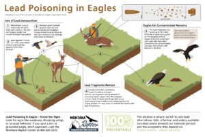 - The primary cause of lead poisoning in raptors is the use of lead ammunition for hunting. When hunters leave gut piles in the field, raptors are attracted to these easy meals. Accidental ingestion of lead-contaminated carcasses exposes them to this harmful toxin.