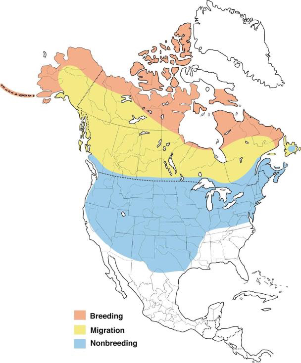 This beautiful bird’s entire population shifts from the arctic breeding grounds to wintering grounds in the U.S. and Southern Canada. Only few will move farther south than central U.S.