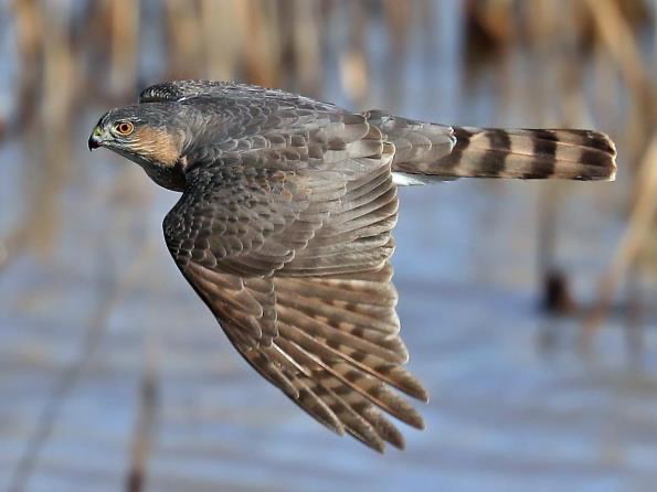 They do not stoop on prey and instead speed through dense woods to surprise their prey, typically other birds. They will breed in deep forests and during nonbreeding season, they hunt small birds and some mammals along forest edges and backyard bird feeders.